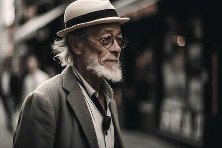 An old man wearing a gray cap and a coat warm smiles warmly while standing on a busy city street, showing the essence of urban life and seniority in a modern setting.