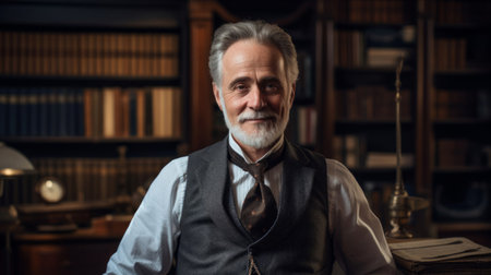 Enthusiast in waistcoat illuminated in scholarly light