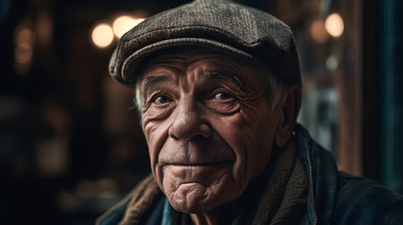 Portrait of an elderly man in a cap and coat sitting in a cafe.