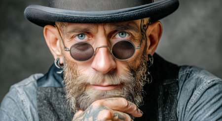 A man is gazing directly at the viewer, showing his intricate tattoos, round sunglasses, and vintage hat in a vibrant urban environment under natural light.