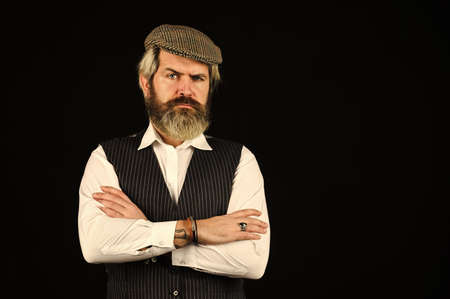 Real masculinity. Masculine appearance. Bearded guy on black background. Man in vintage style hat. Brutal bearded hipster vest. Old fashioned. Beard grooming. Retro gentlemen. Mature handsome man