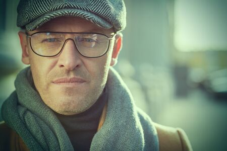 Portrait of an old man with glasses and a cap in the city