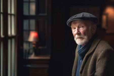 An elderly man stands in soft natural light, looking thoughtfully through a window. His face reflects a lifetime of experiences, evoking a sense of deep contemplation and wisdom.