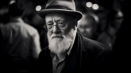 Gray haired senior man with beard looking serious in black and white portrait generated by artificial intelligence