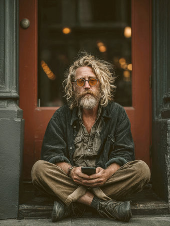 Vertical portrait of a rugged, bearded man with long blonde hair and orange-tinted sunglasses, sitting cross-legged on city steps in corduroy attire, looking directly at the camera while holding a smartphone, conveying a gritty urban lifestyle.