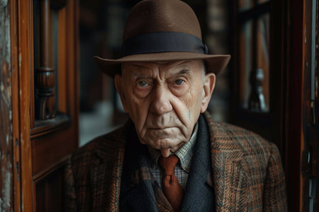 Grandfather in a sports suit stands at the doorway, his serious gaze showing wisdom