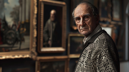 An elderly man stands indoors, holding a framed portrait of himself. His gray hair and beard contrast with the light green wall behind him, highlighting his thoughtful expression.