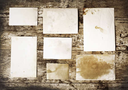 Unique vintage background with original old blank photos on wooden surface, antique backdrop with copy space for your creative design
