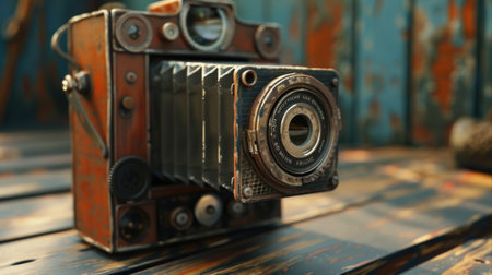 A close-up of a vintage camera with rusted details and worn texture, set against a rustic background. Captures a nostalgic and artistic aesthetic.