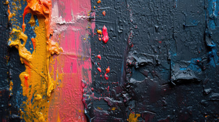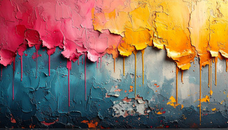 Abstract textured wall with vibrant paint drips in pink, yellow, and blue hues, showing peeling layers.