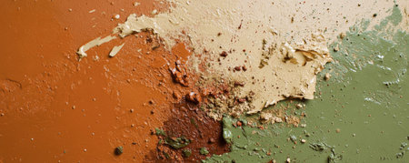 A burst of earthy paints in warm colors like terracotta, olive green, and sienna, with a matte texture and rough splatters that evoke a natural, organic feel.