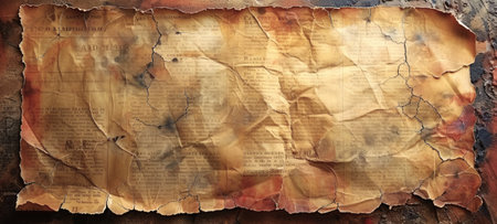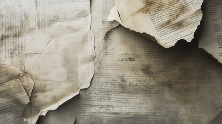 Old newspaper textured background. Vintage aged paper. Layered ancient documents with burn marks and stains. Concept of overlay template, old documents, antiquity, and vintage aesthetic. Copy space