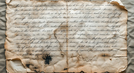 A weathered piece of parchment displays faded handwriting and stains, conveying a sense of nostalgia. This intimate setting features a rustic wooden table, inviting a closer examination of the historical document.