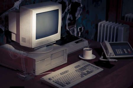 Vintage personal computer with a blank screen is surrounded by old technology in a room with red lighting