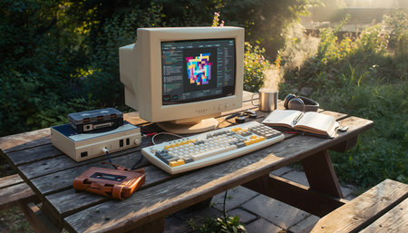 Reviving the glory of the 80s and 90s with a classic setup featuring an old computer, vintage gadgets, and decor that signals nostalgia and history