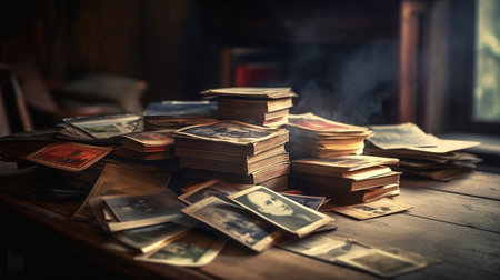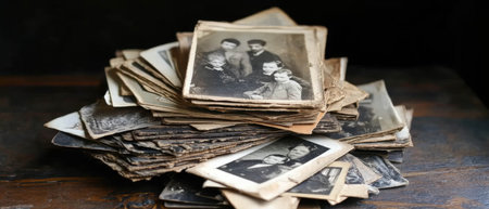 A collection of vintage black and white photographs scattered on an old table evokes a deep sense of nostalgia. Generative AI