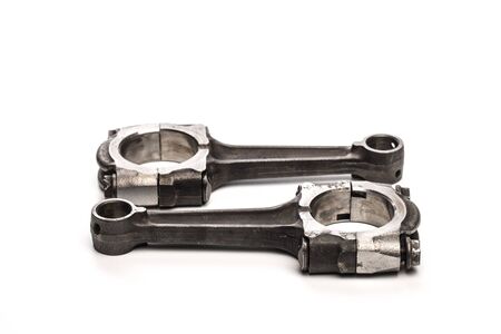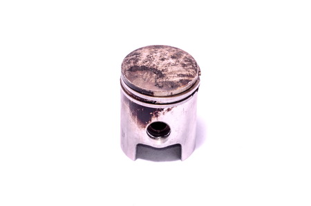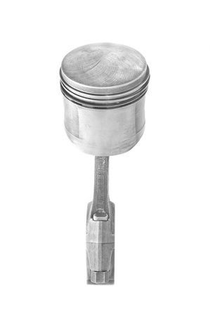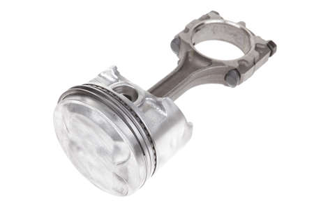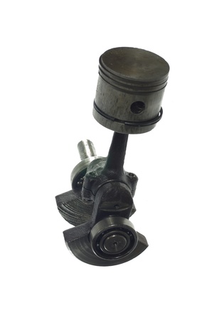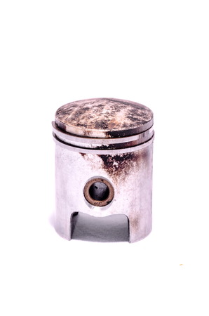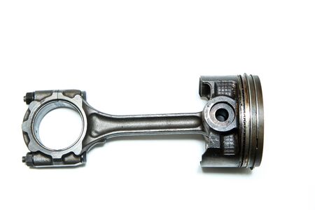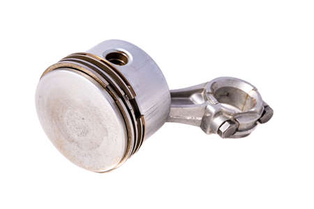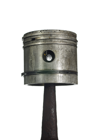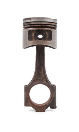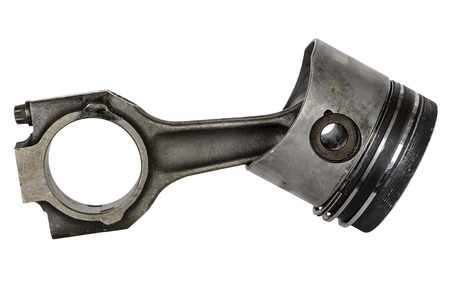 The used and dirty piston with the connecting rod from the sport engine isolated in a white background.