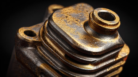 This high-resolution close-up showcases a metallic engine component featuring intricate textures and a rustic finish, ideal for automotive themes.