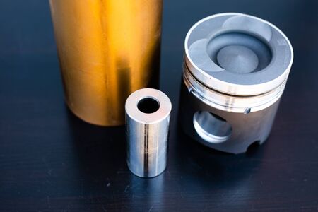 Piston for a four-stroke combustion engine on a metal table. Spare parts for car repair. Dark background.