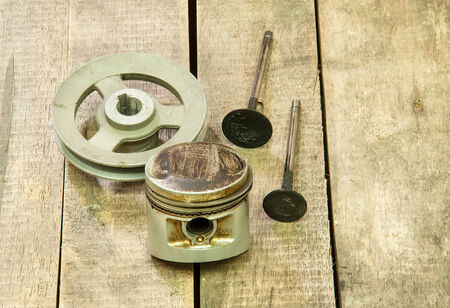 piston of engine on wooden background, Auto parts industry and spare parts background, piston damage in hard works.