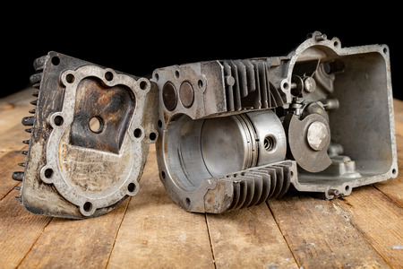 The part of piston and cylinder head of motorcycle engine. The motorbike parts repairing process.