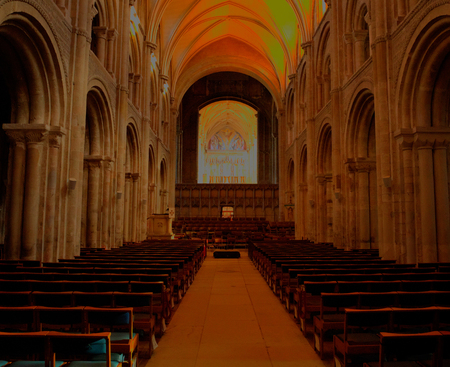 Illuminated Inside of St Magnus Cathedral at Kirkwall, Scotland, low angle view