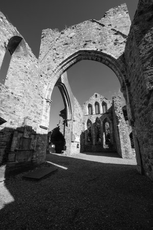 TINTERN, UK - CIRCA SEPTEMBER 2019: Tintern Abbey (Abaty Tyndyrn in Welsh) ruins in black and white