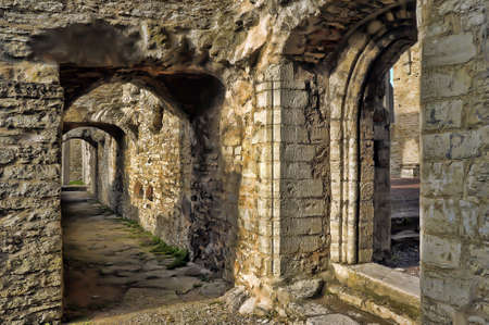 Stone corridor of a medieval castle.