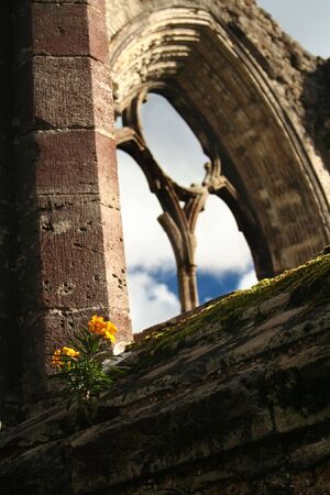 Window in a medieval cathedral ruin with a yellow flower