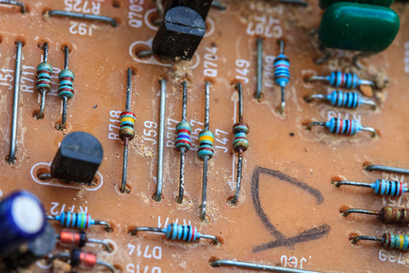 Closeup electronic hardware .Resistor and condensers assembly on the circuit board