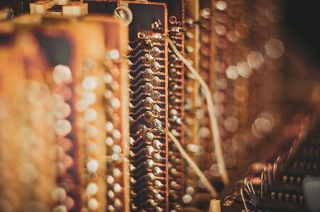 Vintage electronic circuit boards with radio parts and chips, close-up, macro photography