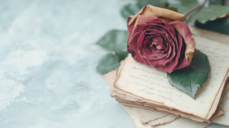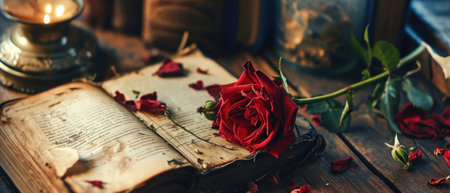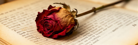 Dried red rose on an open book symbolizing nostalgia and romance. That the image is generated using AI.