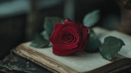 A close-up of a red rose placed gently in a vintage book, representing love and nostalgia, with a soft-focus background.