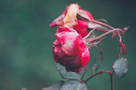 Moody artistic red roses in garden outdoors in faded vintage retro tone