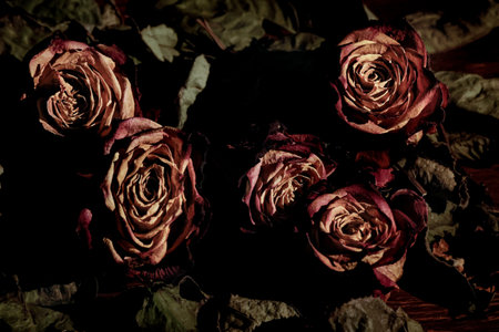 Dry roses on a wooden table. Dark academia aesthetic. Halloween and vintage mood for gothic design.