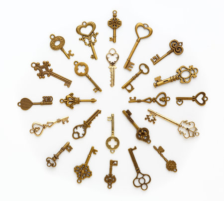 Old keys laid out in a circle shape on white background. Flat lay, top view.