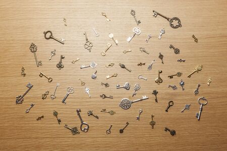 Scattered collection of old keys on a wooden surface, backgroung