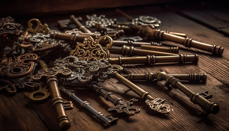 Scattered vintage iron keys on rustic surface showcasing ancient design and history. Perfect for concepts of nostalgia, security, and heritage.