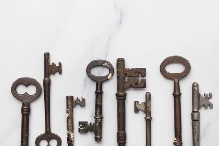 Vintage old fashioned keys on a marble background