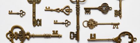 top view of vintage keys on white background, panoramic shot