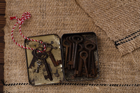 large rusty vintage metal keys in old tin in tin on old grain sacking linen Completely hand made handwoven and homespun