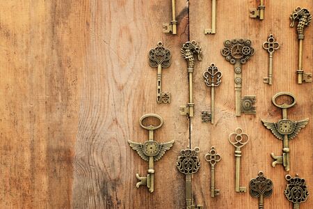 Image of old antique keys over wooden background. Top view, flat lay