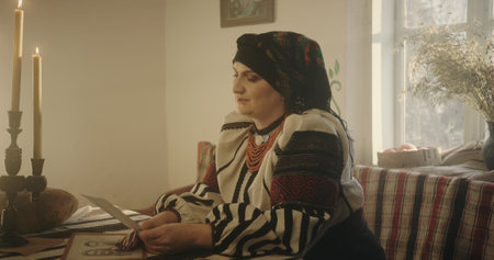 Lviv, Ukraine, January 1, 2023: Ukrainian Woman in Traditional Attire with Candles Reflecting by Window
