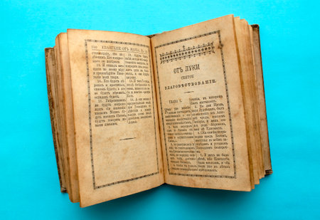 Kokshetau/Kazakhstan - February 17, 2020: Very Old opened Gospel in Old Slavonic language were published in 1915. Vintage damaged Holy Russian Christian book isolated on light blue background.
