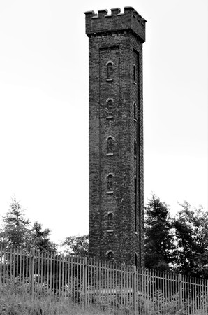 An exterior view of an Ironworks brick chimney tower building in the village of Shotts in Scotland