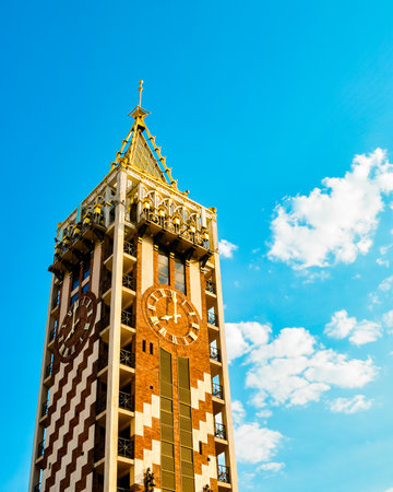 BATUMI, GEORGIA - 4th august, 2022: close up Clock Tower on Piazza Square with narrow old town street