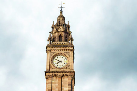 A close-up view of a detailed, ornate clock tower with a visible clock face against a backdrop of soft, cloudy skies.