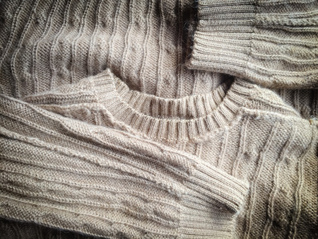 Knitted woolen beige and gray sweaters top view.