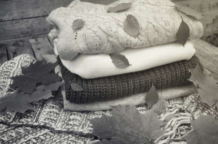 Knitted sweaters and leaves on a wooden background
