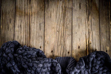 Cozy autumnal background, old rustic wooden table with a warm blanket, copy place for text
